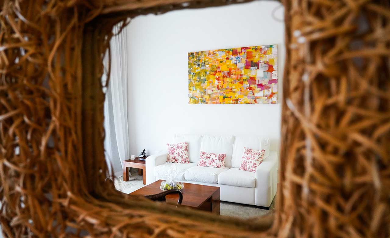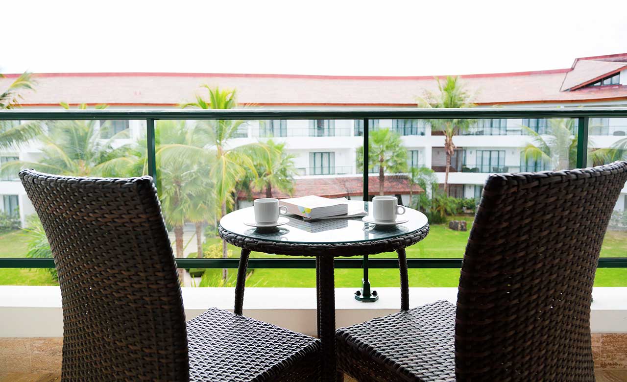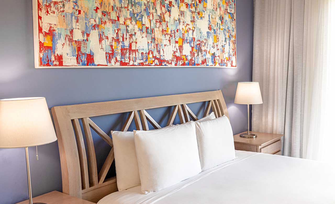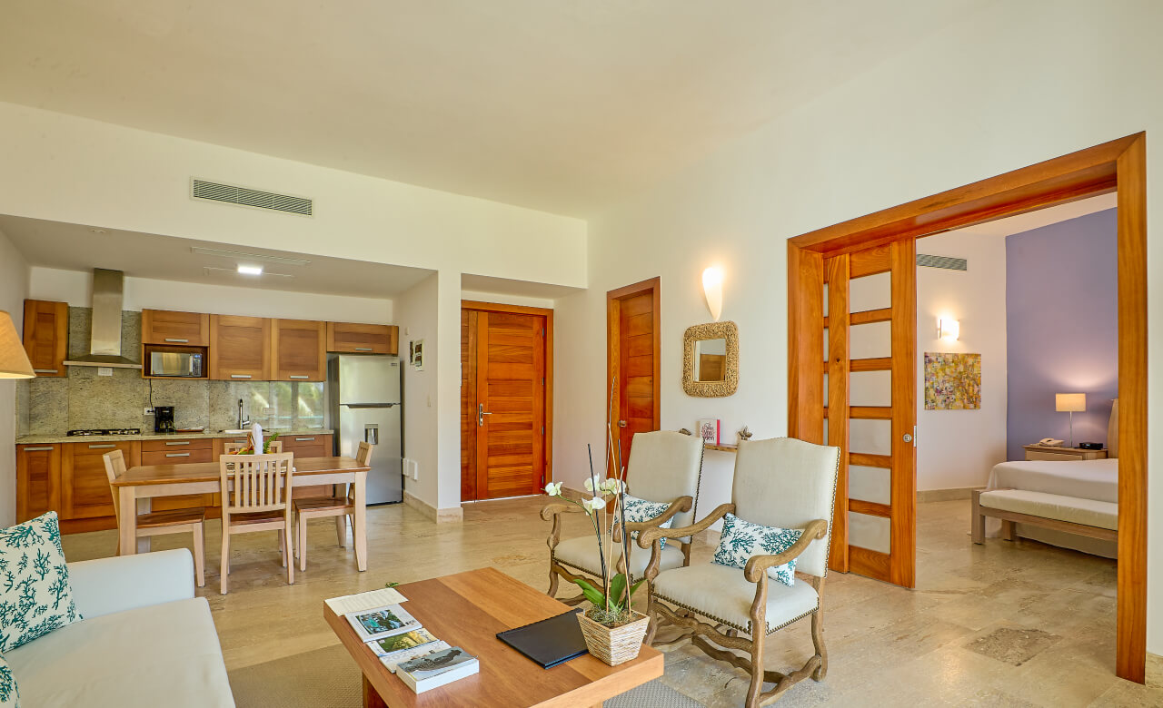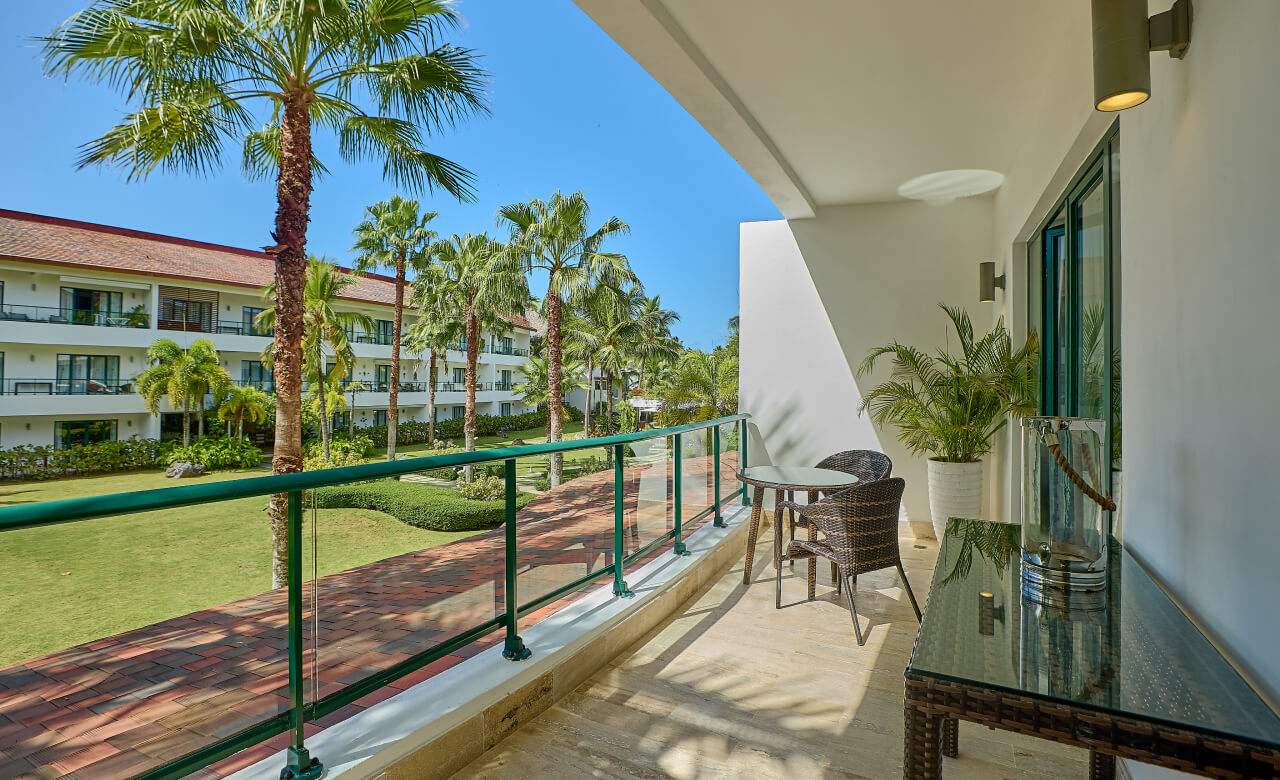 Disfrute de la vista de los frondosos jardines del hotel mientras disfruta de su desayuno desde el balcón o la terraza de esta suite de una habitación con una cocina totalmente equipada, sala de estar y comedor.
