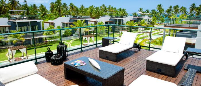 Al salir de la casita se encontraran frente a frente con los canales que los llevará directamente a nuestras fabulosas piscinas y donde estarán lo más cerca posible de la playa. Opte por una estadía en la casita de 2 habitaciones con jacuzzi en el primer nivel o en la casita de 2 habitaciones con una terraza en la azotea con lounge y jacuzzi en el segundo nivel (costo adicional).